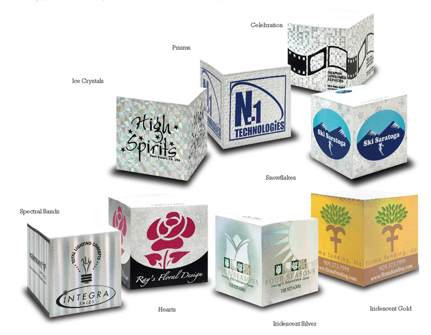 Description: Full color or silk-screened edge printing with a choice of one of eight "metallic" effects. Effect choices: Ice crystals, prisms, celebration, snowflakes, iridescent gold, iridescent silver, hearts and spectral bands (enlarge image to see choices). Printed on white paper; eco paper available (call for pricing). Small pallet for $1.11 per each.